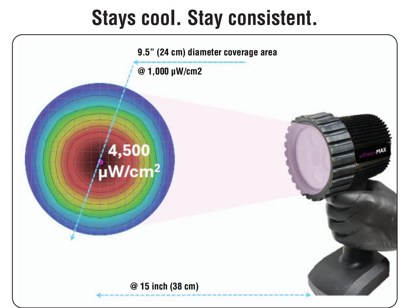 uVision™ MAX 系列代表了 Spectro-UV 在手持式无损检测技术领域的又一次革新。该系列灯具采用创新的 4 透镜配置,在 15 英寸(38 cm)工作距离下可提供优化的广角 UV-A 覆盖范围,覆盖区域直径达 9.5 英寸(24 cm)。MAX 系列基于成熟的 uVision 平台打造,延续了备受专业人士信赖的 IP65 防护等级、无风扇热管理系统以及合规性设计等优异特性。