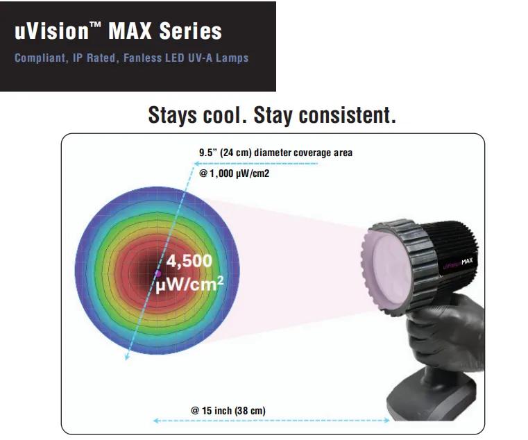 uVision™ MAX 系列代表了 Spectro-UV 在手持式无损检测技术领域的又一次革新。该灯具在 38 cm工作距离下可提供广角 UV-A覆盖,覆盖区域直径达 24 cm。该系列基于成熟的 uVision 平台打造,具有IP65 防护等级、无风扇热管理以及合规等特性。
