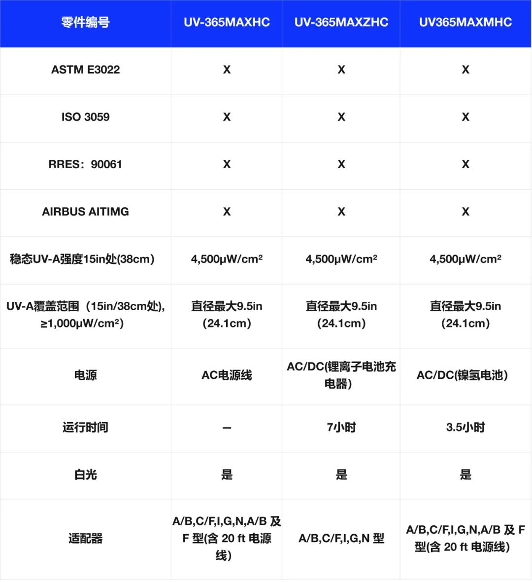 注:UV-A 强度读数采用 SpectroUV AccuMAX 系列测量仪测得,出厂时已设定为所示数值。
